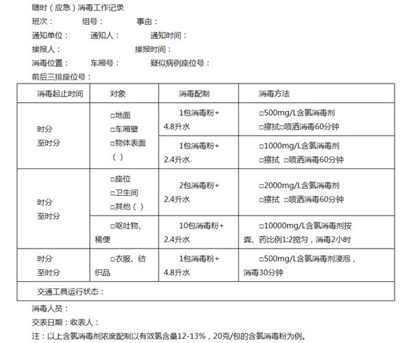 2.根据疾控部门的指导确定消毒范围,对疑似病例的生活用品(包括餐具、洗漱用品、痰罐等)、排泄物、呕吐物(含口鼻分泌物、脓液、痂皮等)等,用应急呕吐包覆盖包裹,或用干毛巾覆盖后喷洒10000mg/L含氯消毒剂至湿润;对疑似病例座位及其前后三排座位用有效氯1000mg/L-2000mg/L含氯消毒剂进行喷雾处理或2-3遍的擦拭消毒。具体方法由疾控中心对相关人员进行培训。