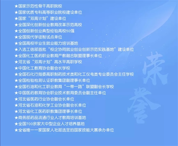 近年来,学校与沧州临港经济技术开发区、中国检验检疫科学研究院、万华化学集团、华药集团、石药集团、神威药业集团、河北旭阳集团、新道科技股份有限公司、石家庄循环化工园区等开展深度合作,探索产教融合新模式,共同为毕业生打造实训、就业、创业三大平台,为高质量就业保驾护航。